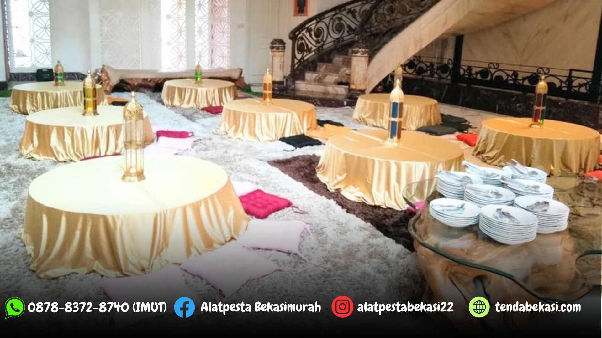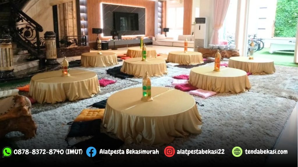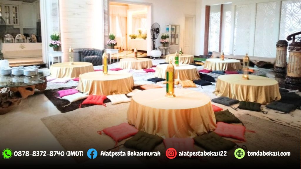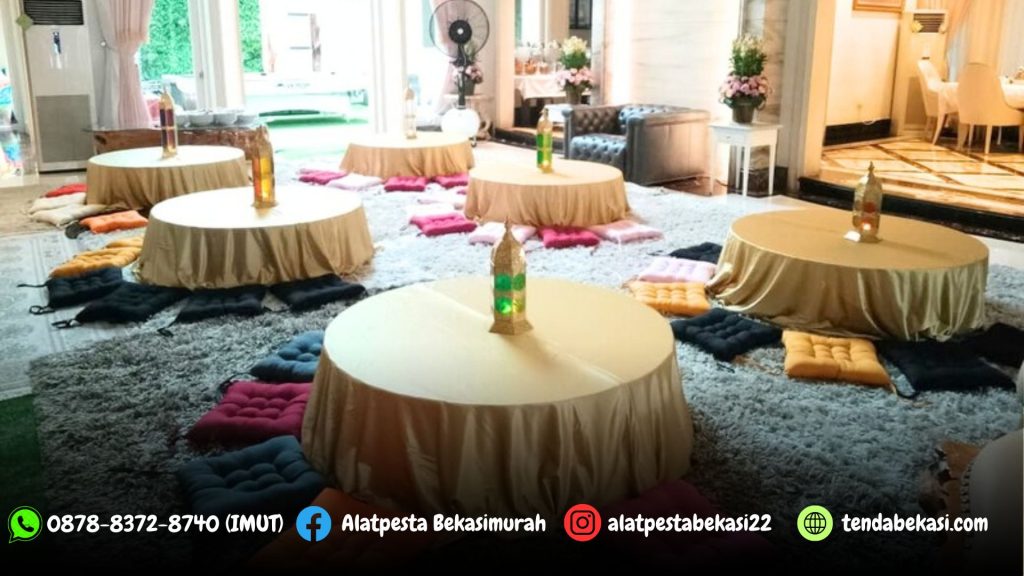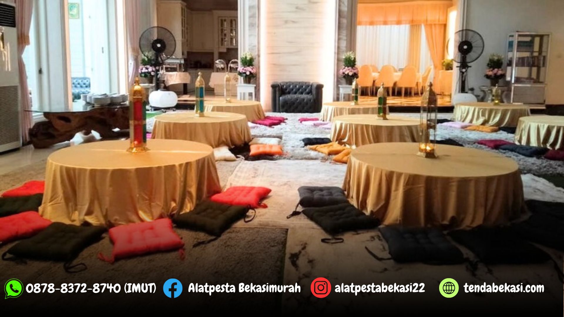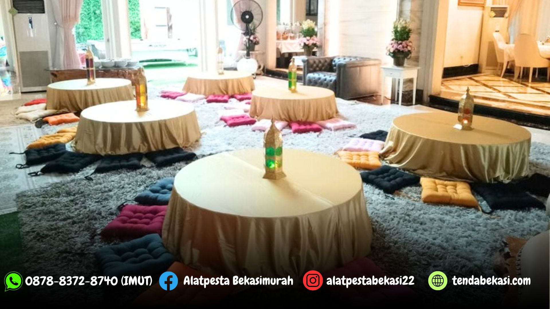 Pusat sewa alat pesta kami menyediakan Sewa Meja Bundar Lesehan dan Bantal Lesehan Jakarta Barat dengan kualitas terbaik siap kirim dan setting langsung sesuai permintaan customer.