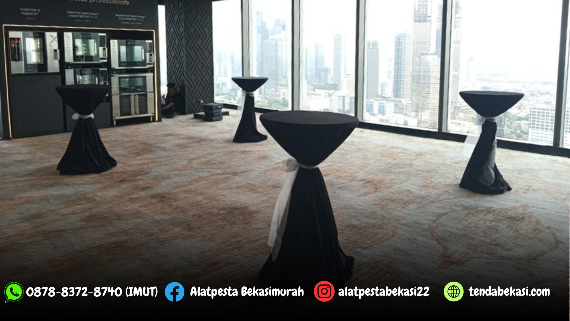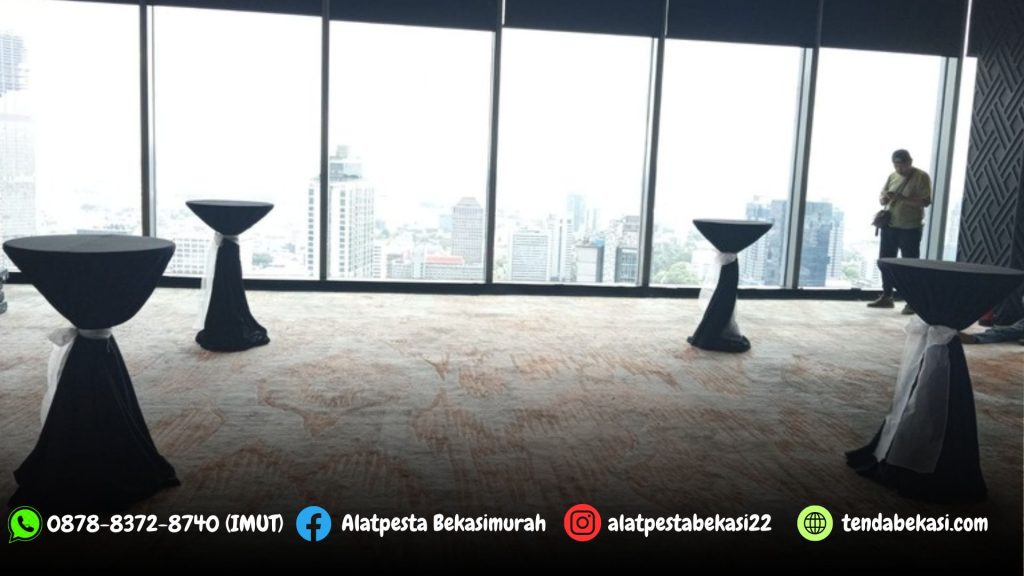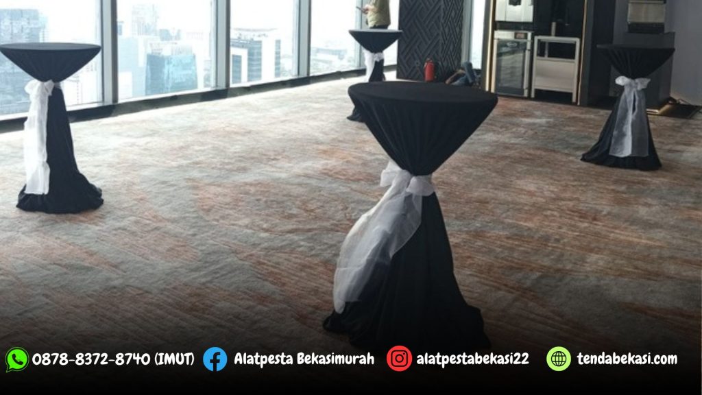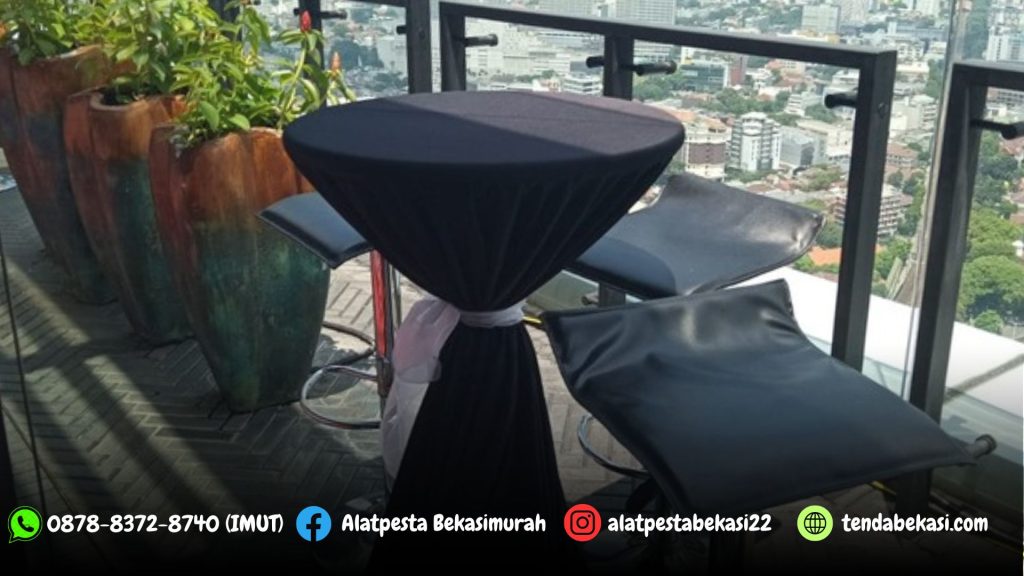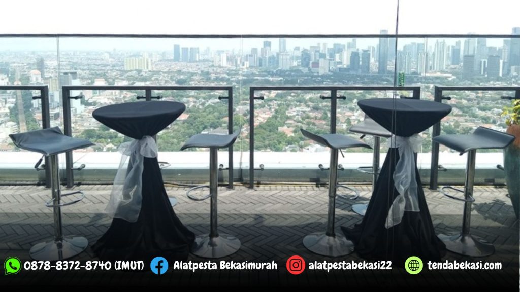 Pusat Jasa Sewa alat pesta kami menyediakan Sewa Meja Barstool Dengan Cover Hitam dan Pita Silver Jakartal. Meja barstool dengan kualitas terbaik, modelnya yang kekinan dan modern, tentunya sangat cocok untuk acara dengan tema kafe.